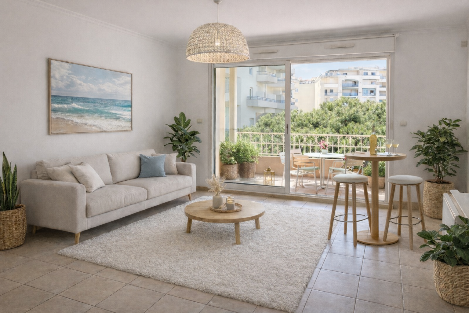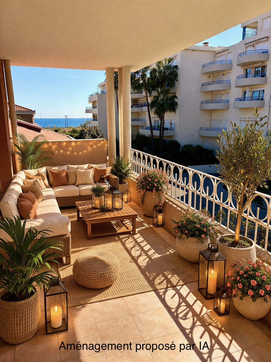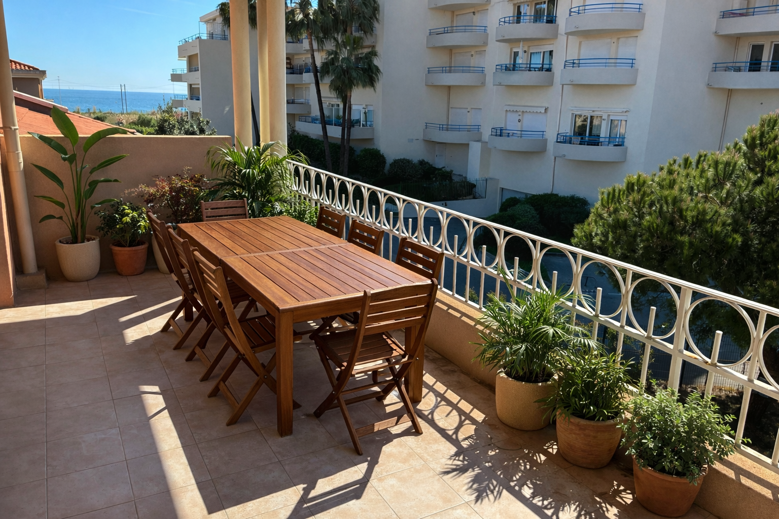 – d’un séjour donnant sur belle terrasse de 12m² exposée Sud avec vue sur le parc et la mer ,